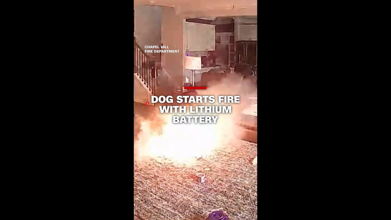 A dog in North Carolina nearly caught his home on fire after playing with a device with a lithium battery in it. The dog named Colton was home alone when he grabbed ahold of the device and started playing with it on the living room rug. Moments later, smoke and flames burst out of the device as Colton runs up the stairs. Luckily for Colton, the fire went out quickly, and no one was injured. Colton’s owner, a firefighter, shared the video to show the importance of storing items with lithium batteries correctly. #cnn, #news